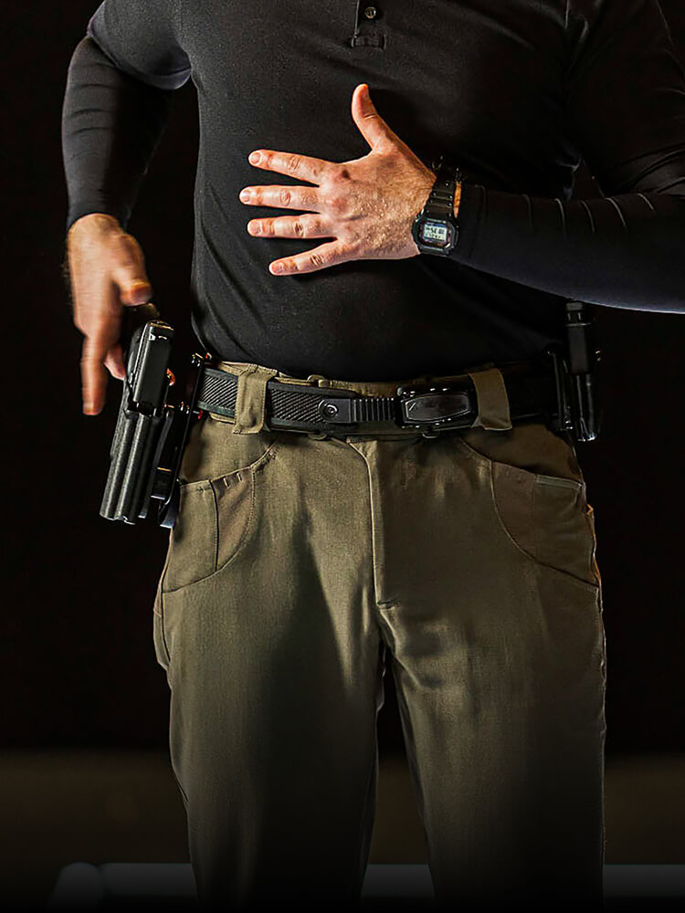 Die Hose hat 5 doppelte Gürtelschlaufen. In die äußeren Schlaufen passen Standard-Wettkampfgürtel mit bis zu 5 cm Breite.
